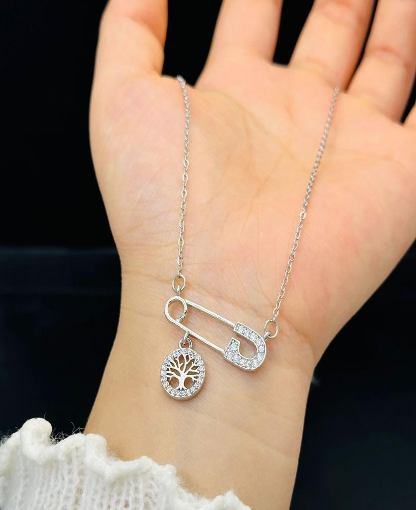 ارتقي بإطلالتك بقطعة تحمل المعنى والأناقة معًا. هذا العقد الفاخر يجمع بين تصميم عصري أنيق ودلالة روحية عميقة، بفضل تعليقة شجرة الحياة المزينة بفصوص براقة متدلية من دبوس أمان مرصع بالزركون اللامع.