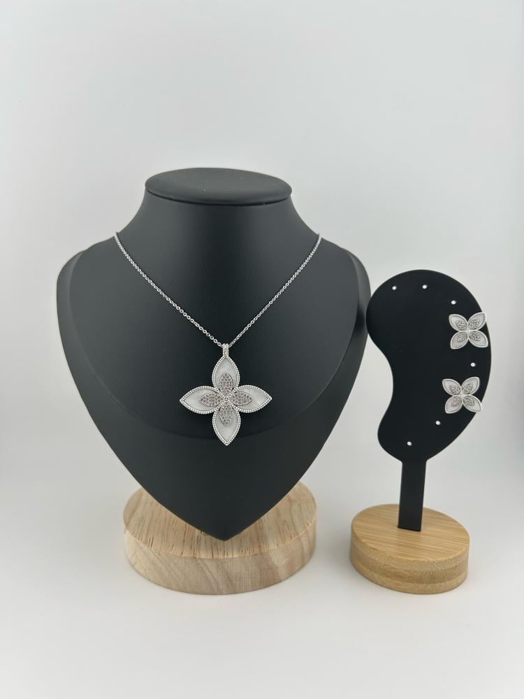 القلادة تنسدل بخفة على الرقبة، مصمّمة عشان تبان وتزينك بدون ما تطغى على طلتك، والحلقات بنفس التصميم تضيف توازن أنثوي فخم يكمّل حضورك بكل تفاصيله.